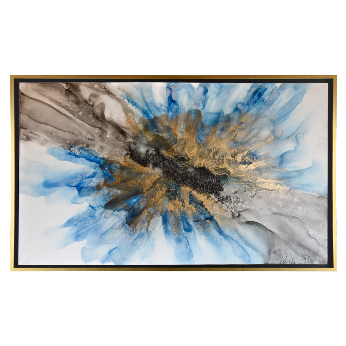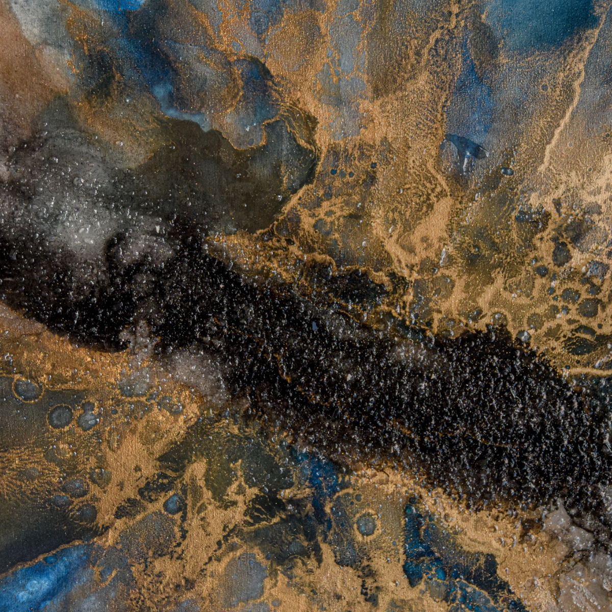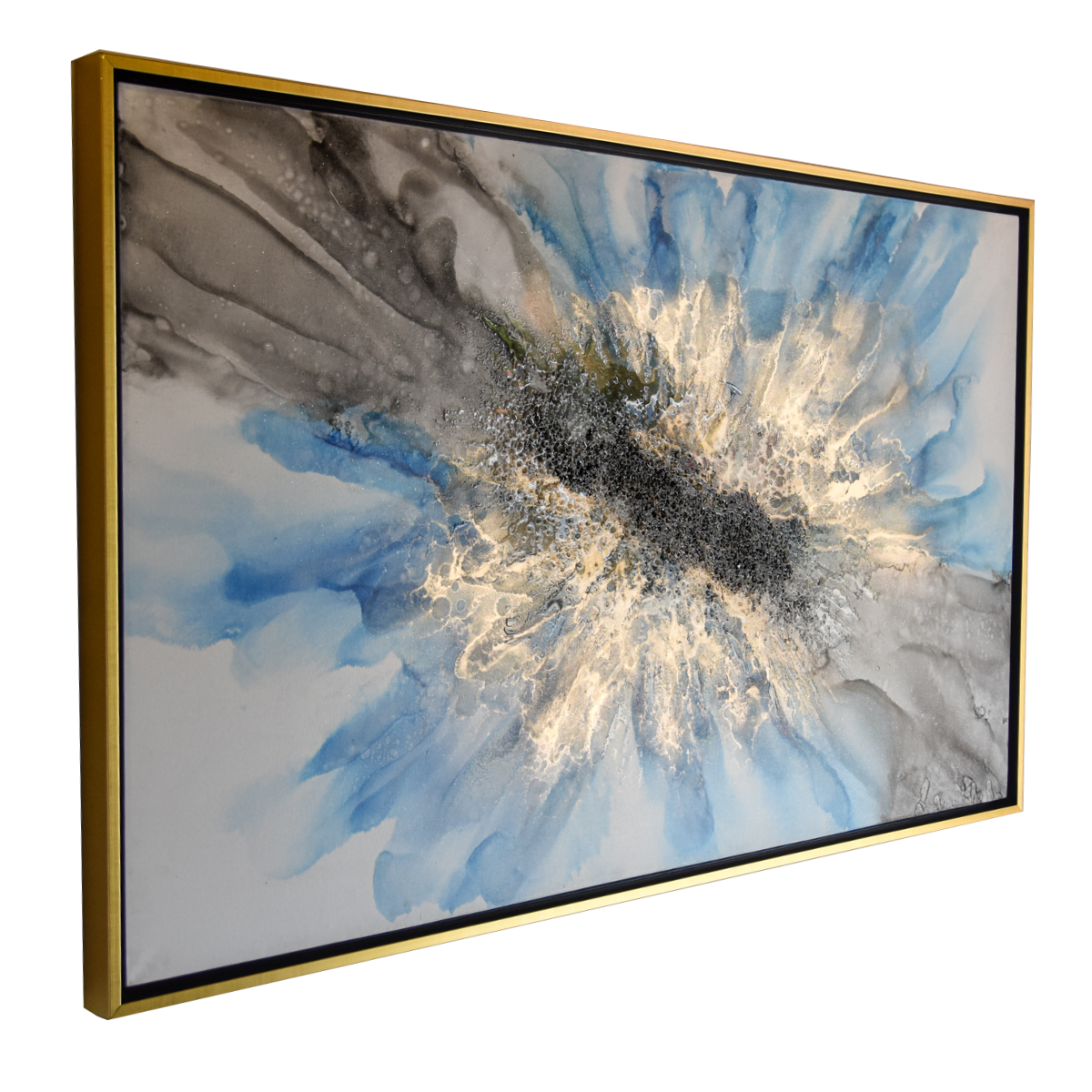 Tonos azules y dorados se expanden en todas direcciones, como un resplandor que emerge desde lo profundo del agua. La obra transmite la sensación de un amanecer líquido, donde la luz se funde con la energía del océano en movimiento.
