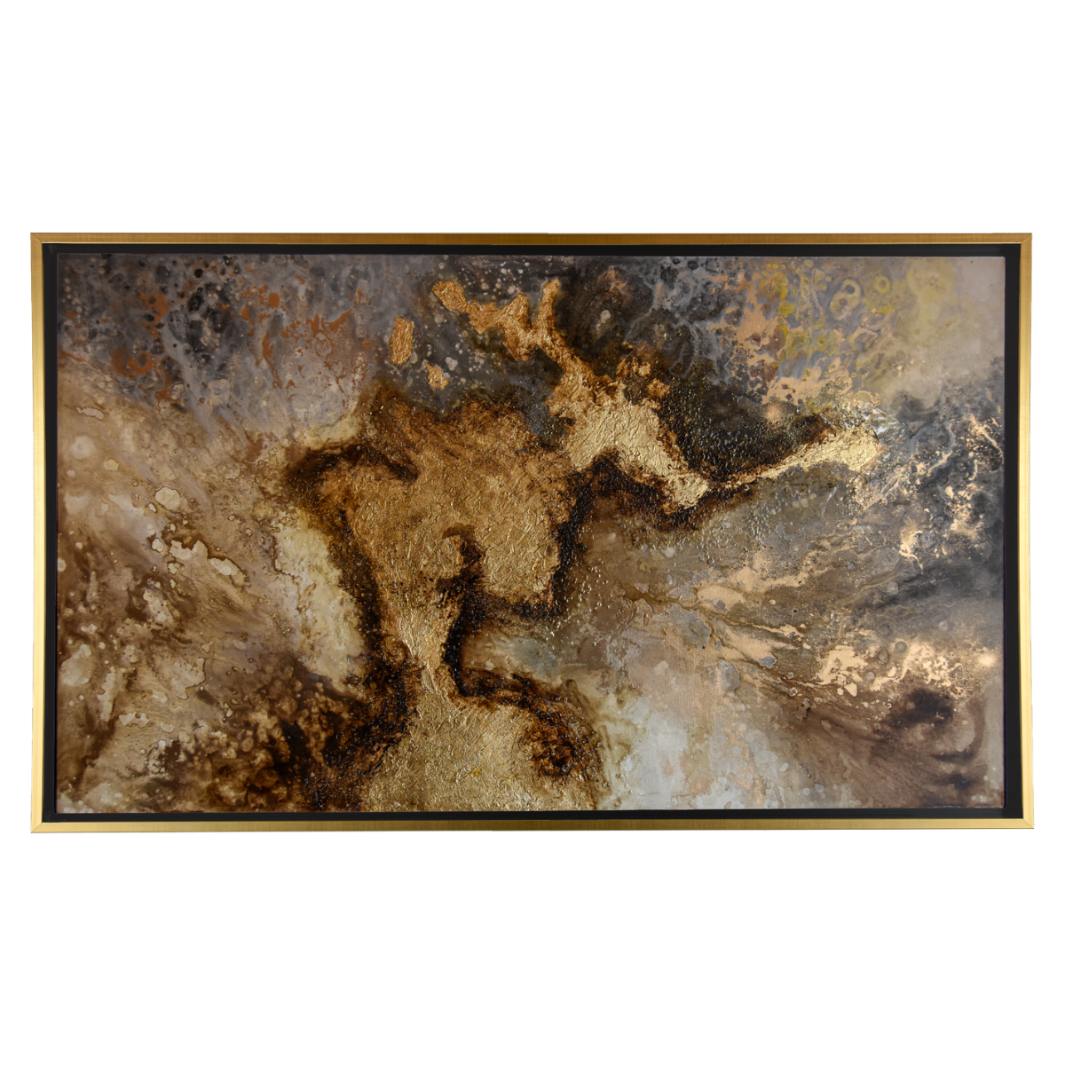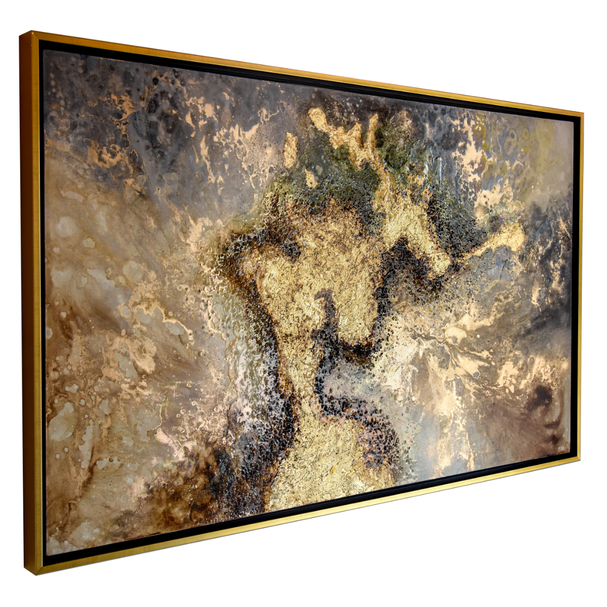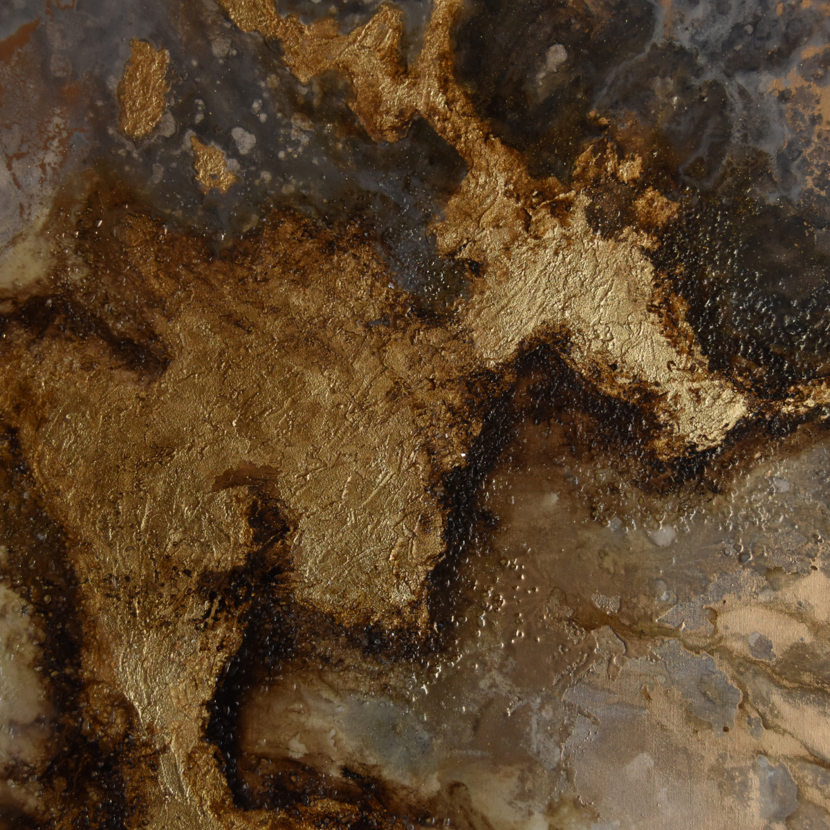 La superficie se abre en texturas profundas donde los tonos dorados laten como fuego interno. La obra evoca la fuerza vital que habita en lo subterráneo: un pulso ancestral que sostiene y nutre, recordando que bajo cada capa de silencio, la tierra guarda su energía más pura.