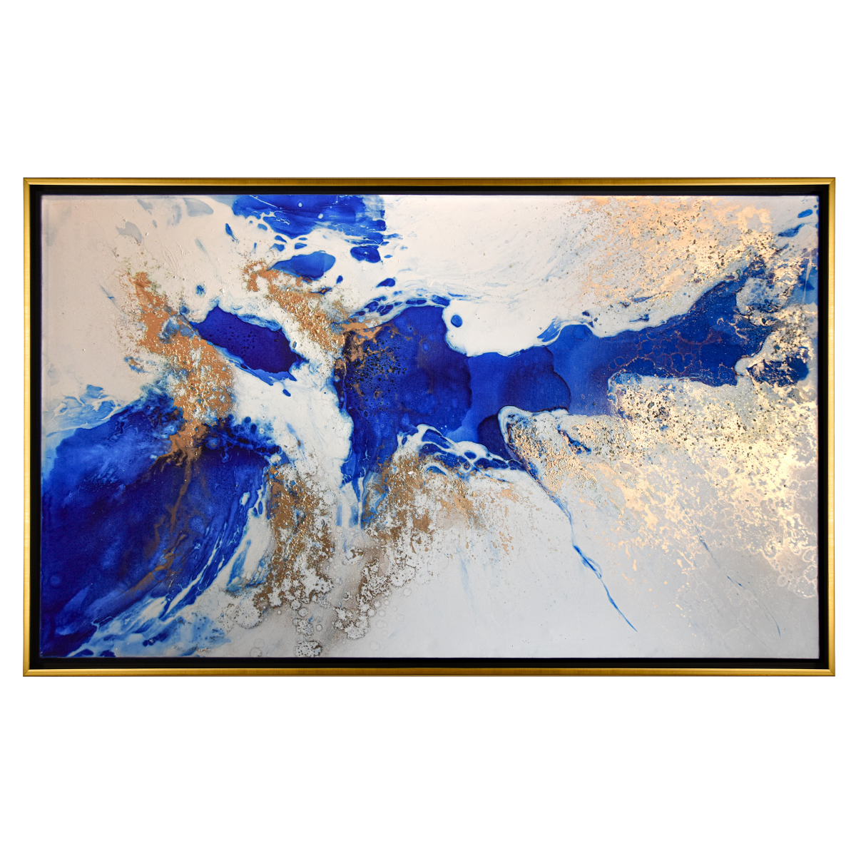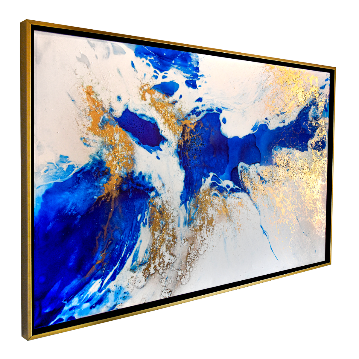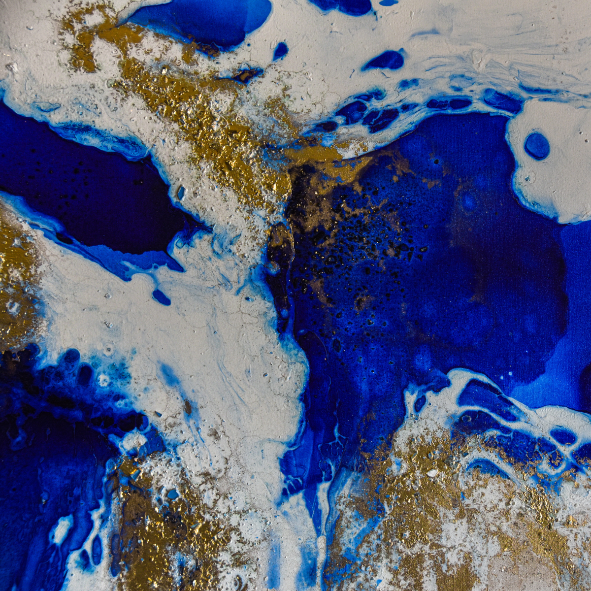 Un movimiento fluido atraviesa la superficie, uniendo azules intensos con fragmentos dorados que parecen flotar en suspensión. La composición refleja el curso interminable de la energía, donde cada trazo sugiere continuidad más allá del marco.