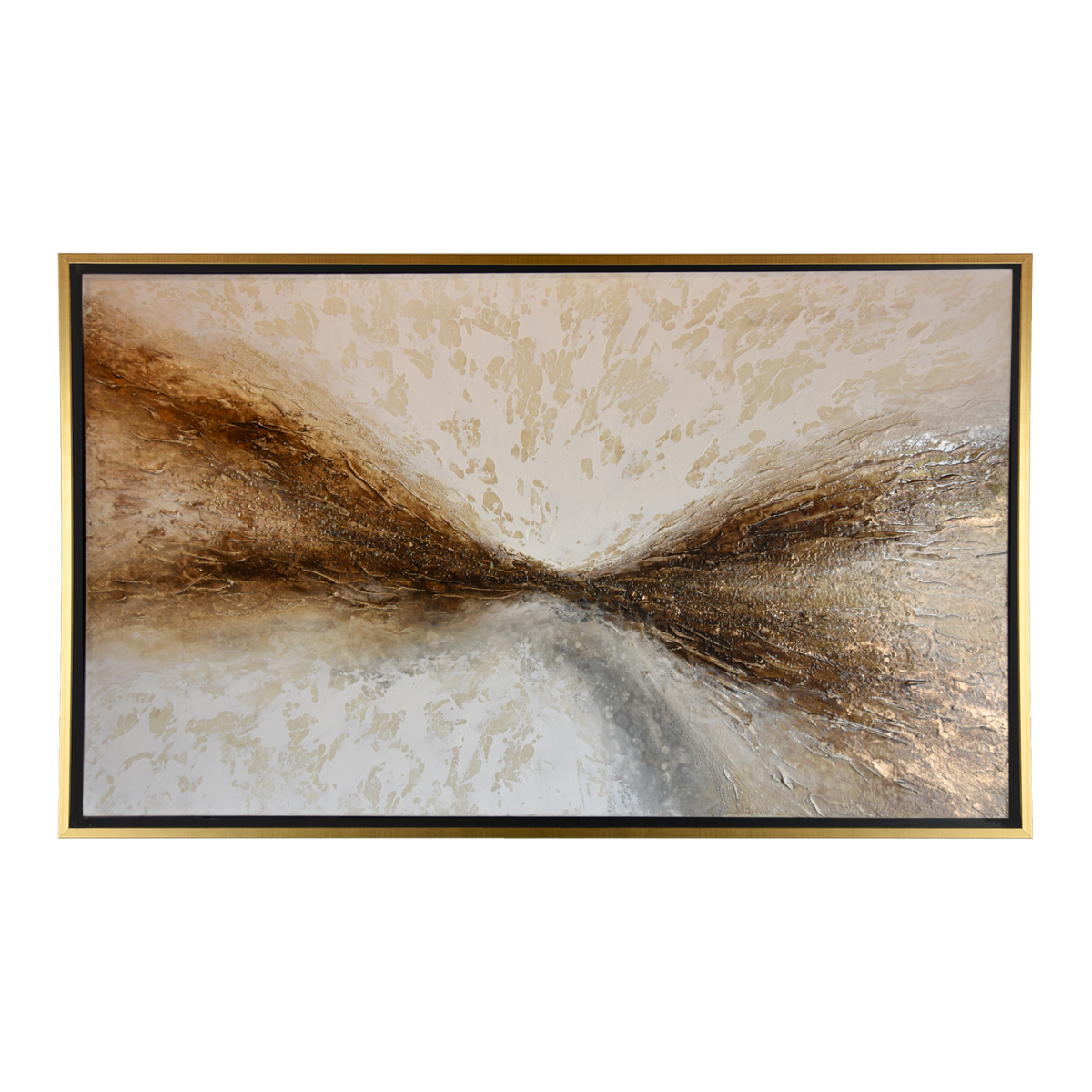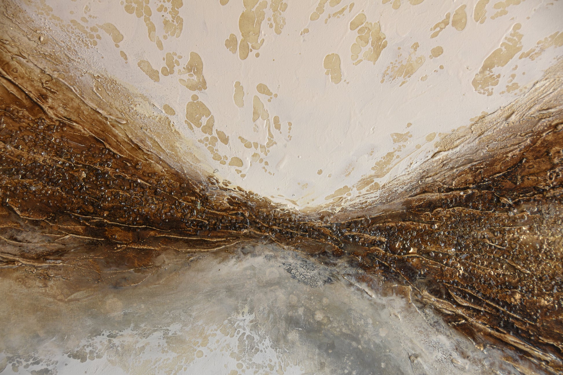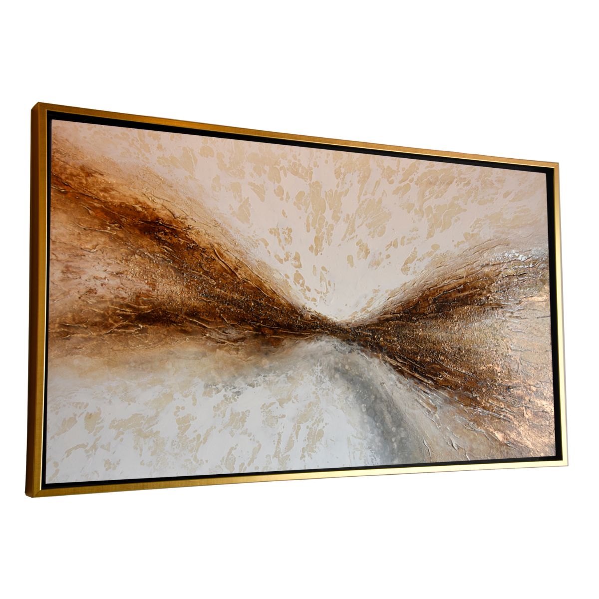 En el centro, dos corrientes se encuentran sin tocarse, como un susurro que viaja en direcciones opuestas. Las texturas doradas y ocres se funden con la luz, evocando un instante suspendido donde todo calla para dejar que la forma hable. Es el lugar donde el tiempo se detiene y el vacío se vuelve elocuente.