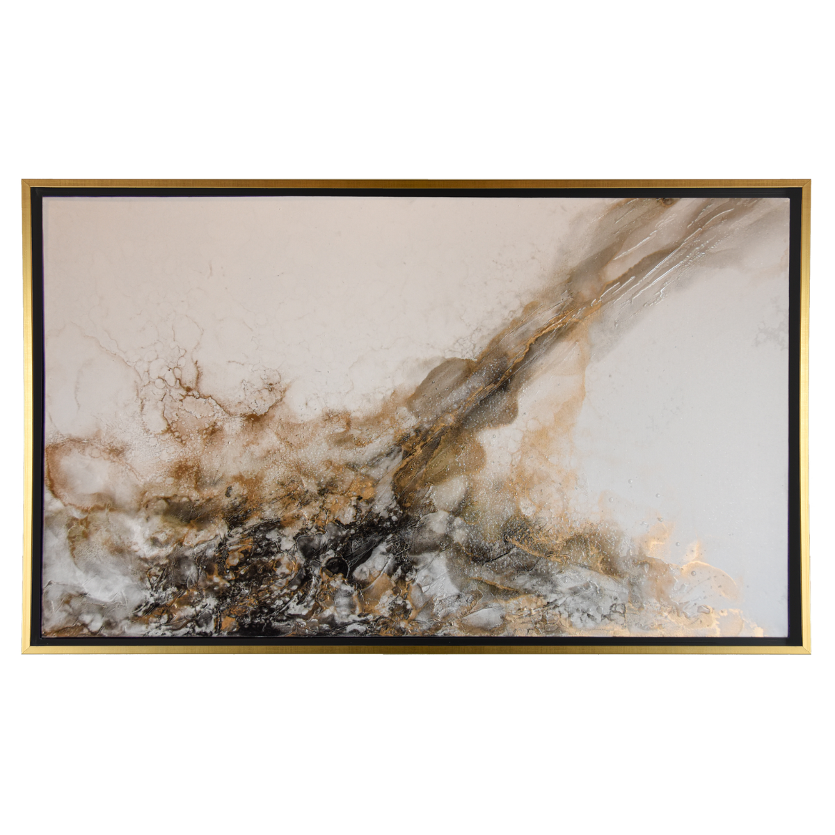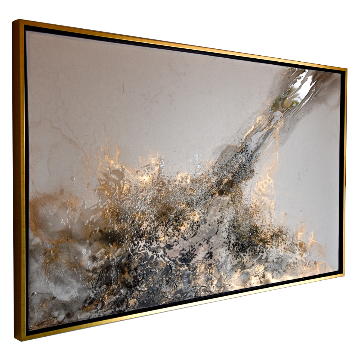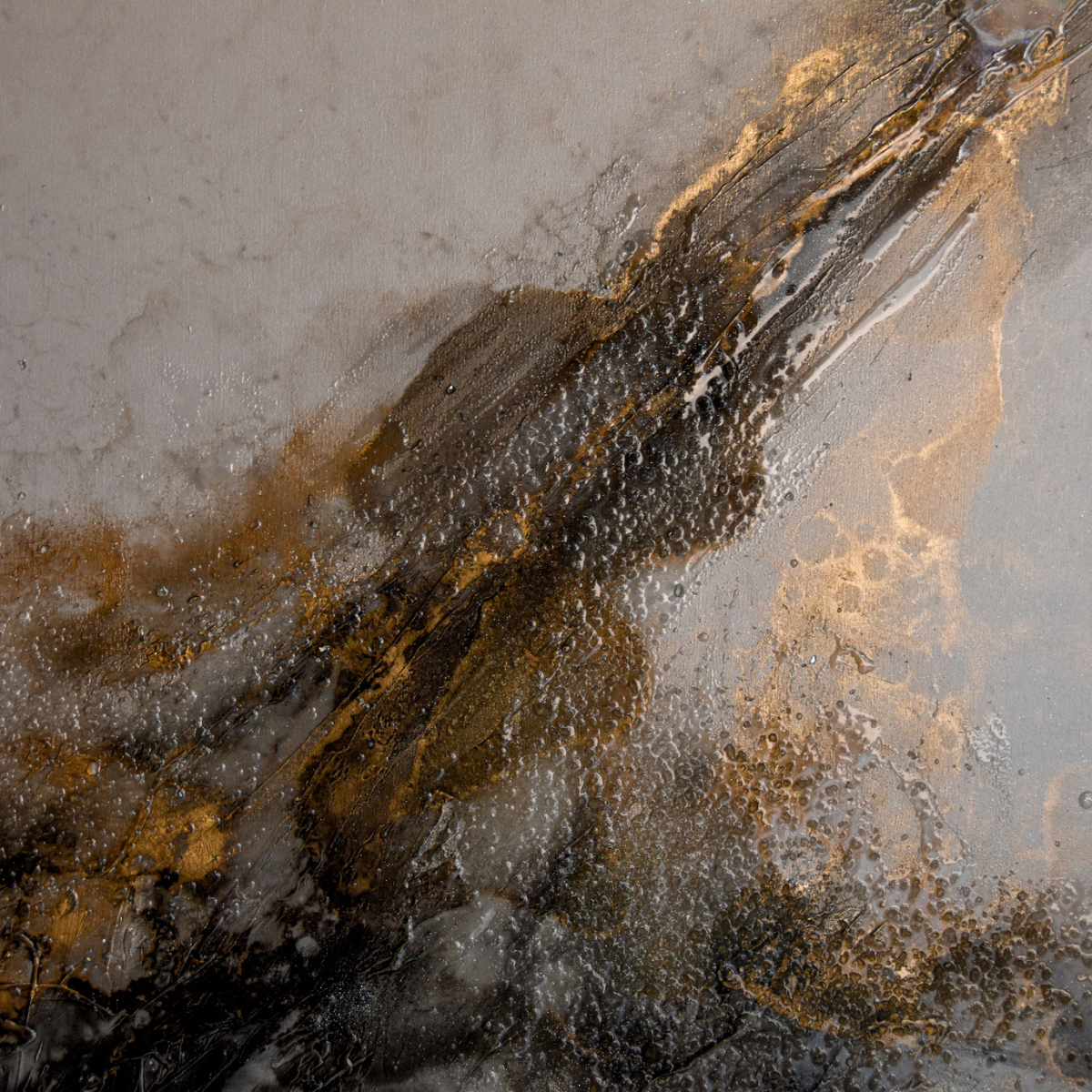La fuerza se eleva desde la base en un impulso que mezcla tonos oscuros y dorados. El trazo diagonal rompe la quietud del fondo claro, evocando movimiento continuo, como una corriente que asciende y se expande con determinación.