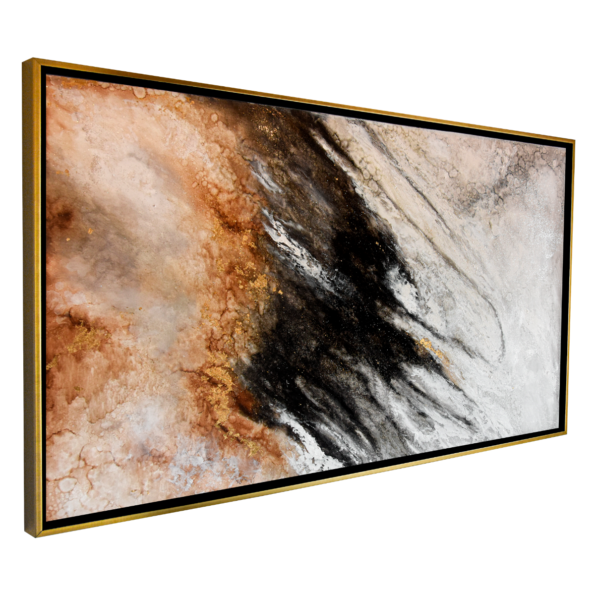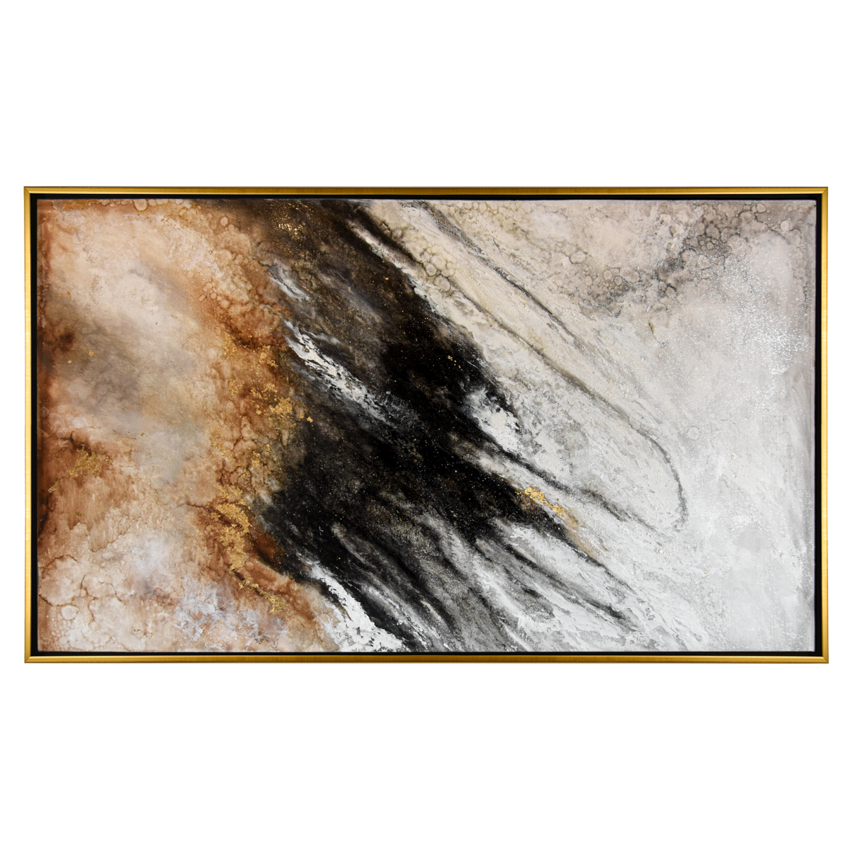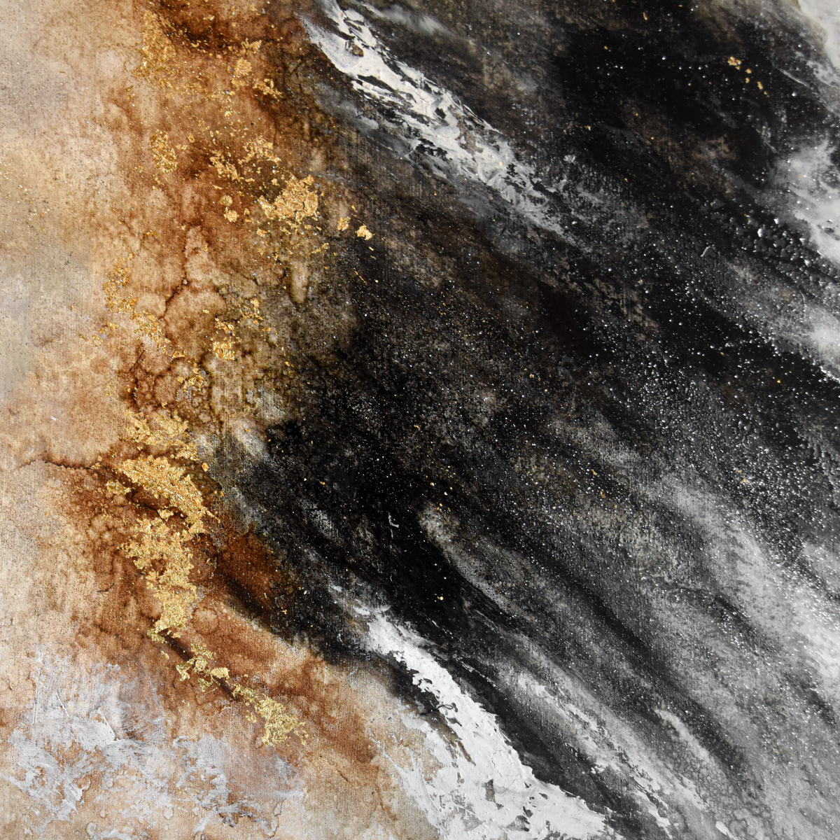 Oscuros y dorados se entrelazan en un movimiento que recuerda al origen mismo de la materia. La obra transmite la potencia de lo esencial: corrientes que chocan, se expanden y se transforman, evocando la energía bruta que sostiene la creación.