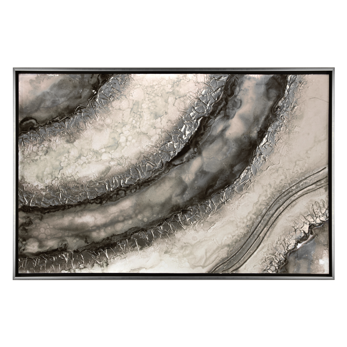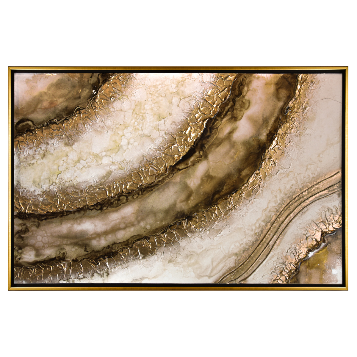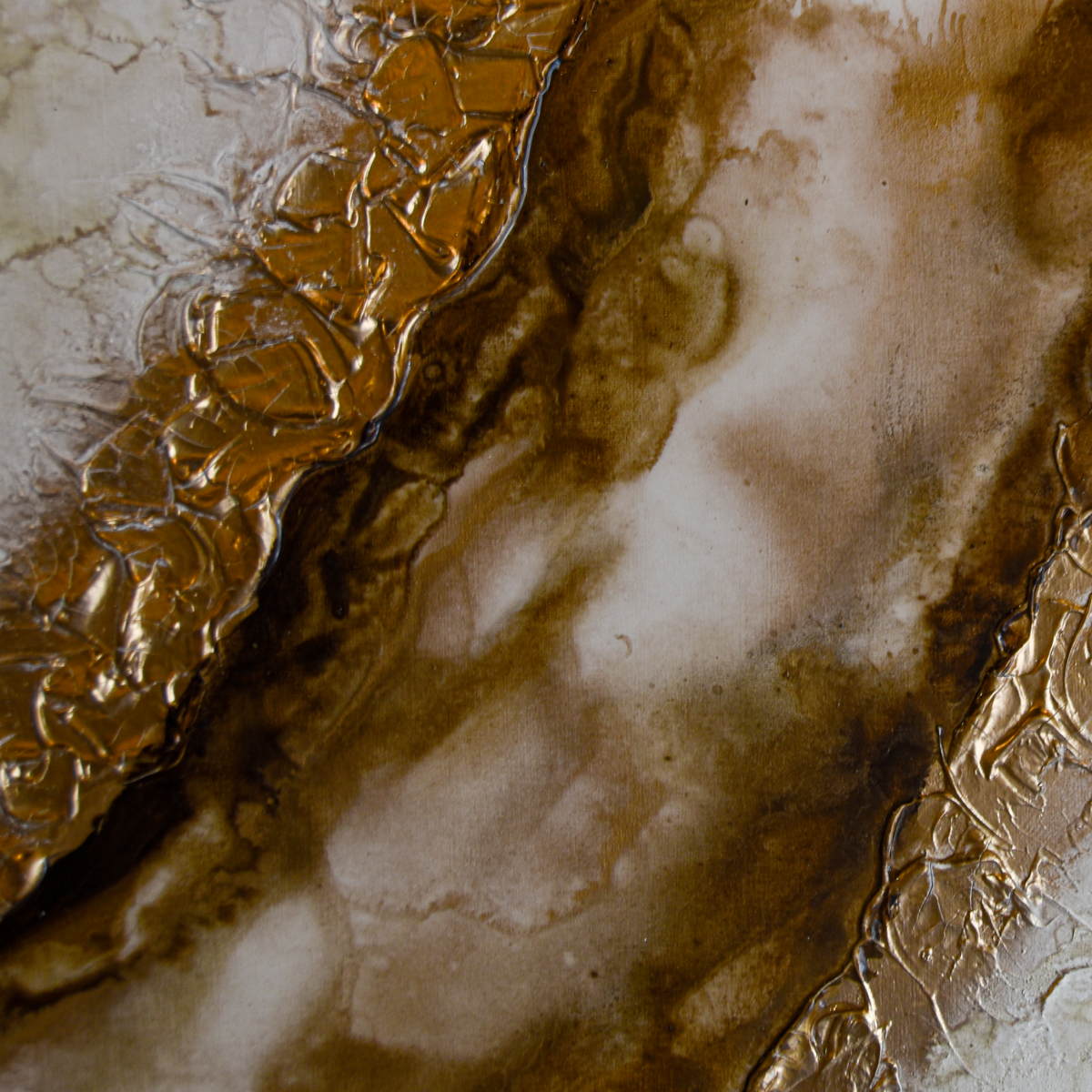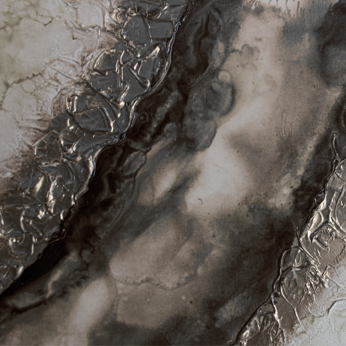 Como un mapa sin nombre, la obra revela caminos que no se recorren con los pies, sino con la memoria. Sus texturas guardan pliegues del alma, capas que el tiempo sedimenta en silencio. Entre luces y sombras emergen destellos minerales, un lenguaje ancestral que habla de lo que se transforma y permanece dentro de nosotros.