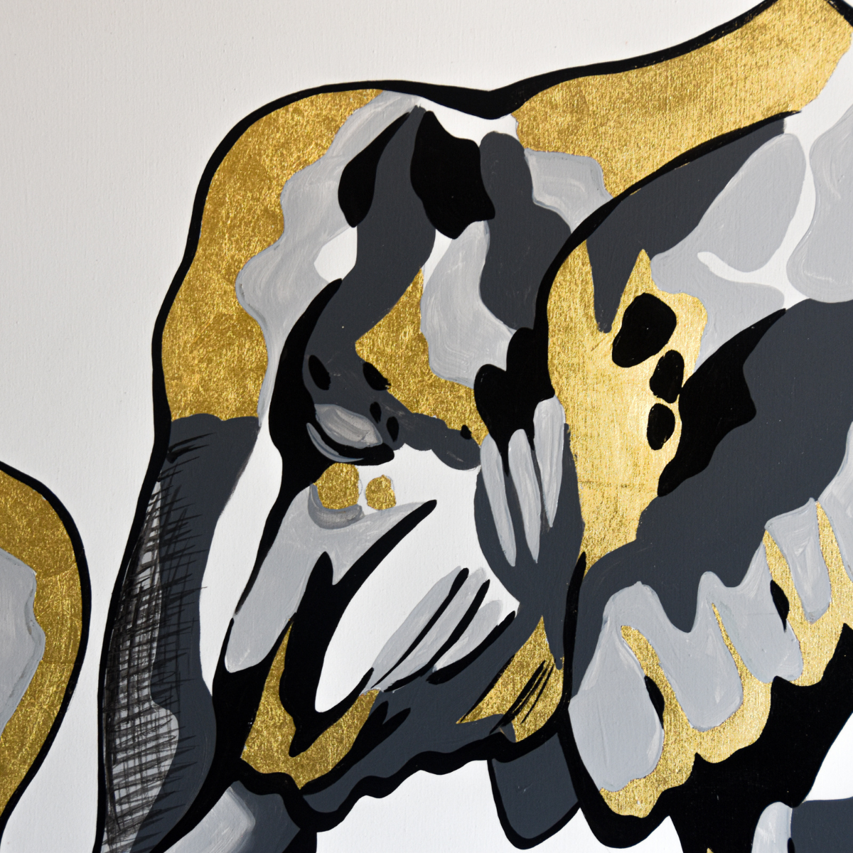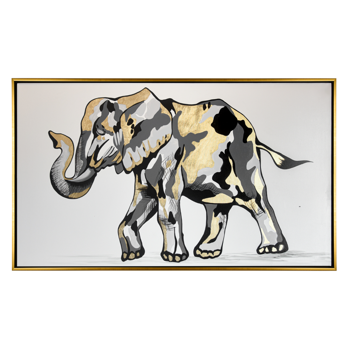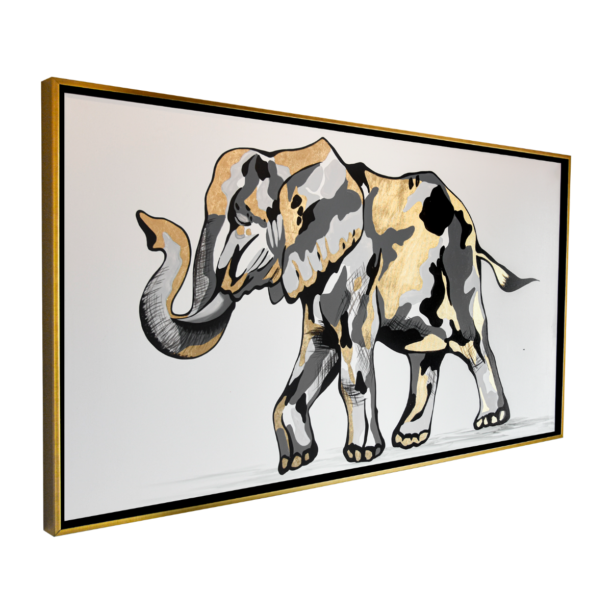 El elefante avanza con paso firme, envuelto en un manto de tonos grises y destellos dorados que parecen narrar historias antiguas. Su figura combina la fuerza imponente de la naturaleza con la delicadeza del arte, convirtiéndose en un símbolo de poder tranquilo y sabiduría atemporal. El oro, como luz atrapada en su piel, sugiere grandeza, resiliencia y un legado que trasciende el instante.