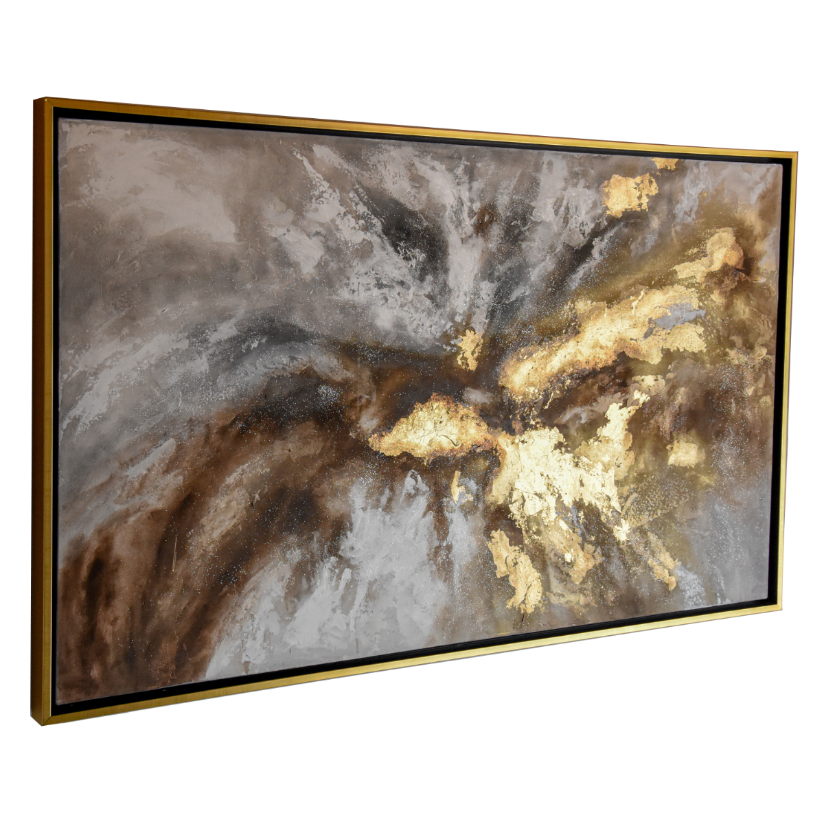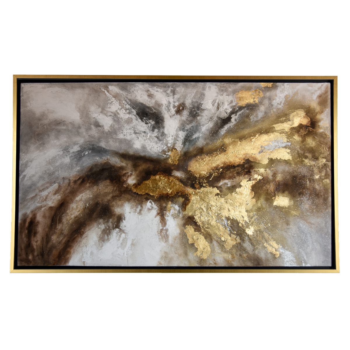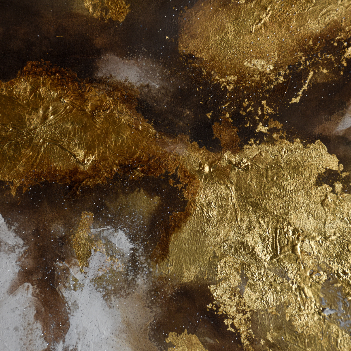 Trazos dorados emergen entre veladuras oscuras y claros profundos, como destellos que habitan en lo interior. La obra evoca la esencia invisible que se expande y se transforma, un resplandor íntimo que revela la fuerza silenciosa de lo eterno.